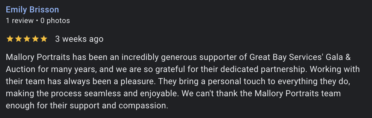 "...thank you SO much!!! This really goes a long way in helping a lot people that we serve. We are grateful to Mallory portraits!!"
